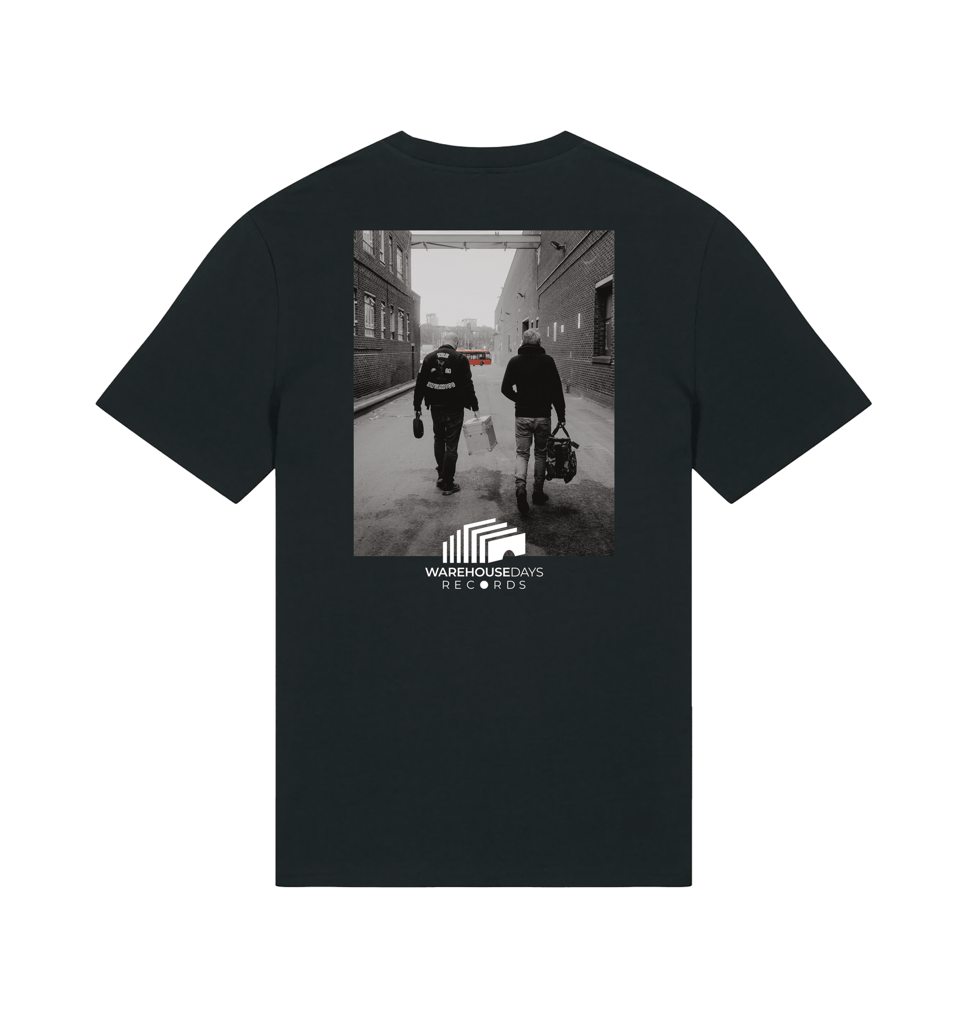 This organic t-shirt features big prints of the front and back of Warehouse Days album cover.